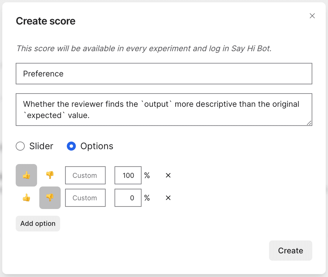 Once you create a score, it will automatically appear in the "Scores" section in each experiment and log event throughout the project.
